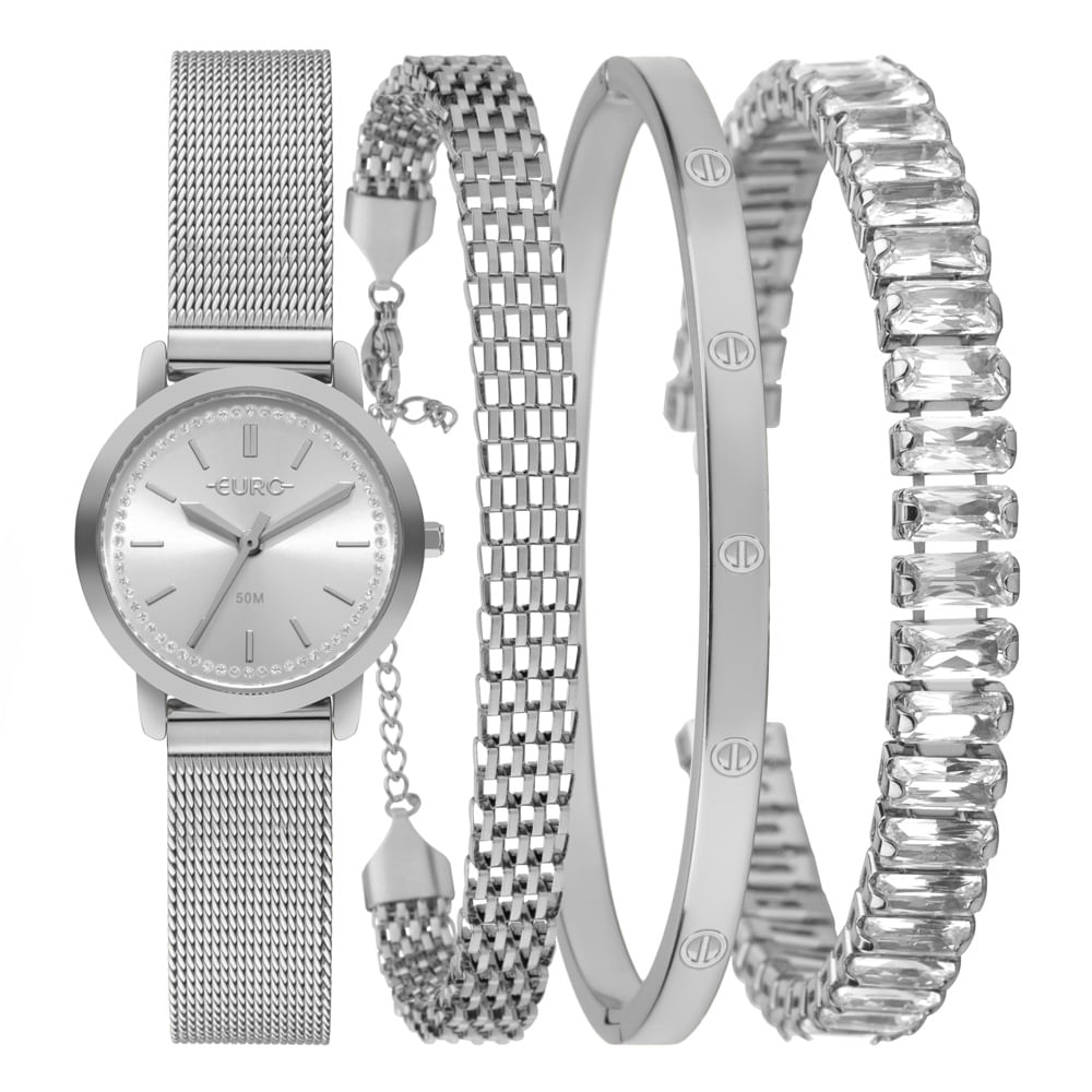 Com design refinado e mostradores sofisticado, a Euro Mix transforma qualquer look. Perfeita para quem ama versatilidade e um look com mix de acessórios. Com braceletes complementares atemporais e refinados, é um conjunto pensado como jóia de pulso autoral.