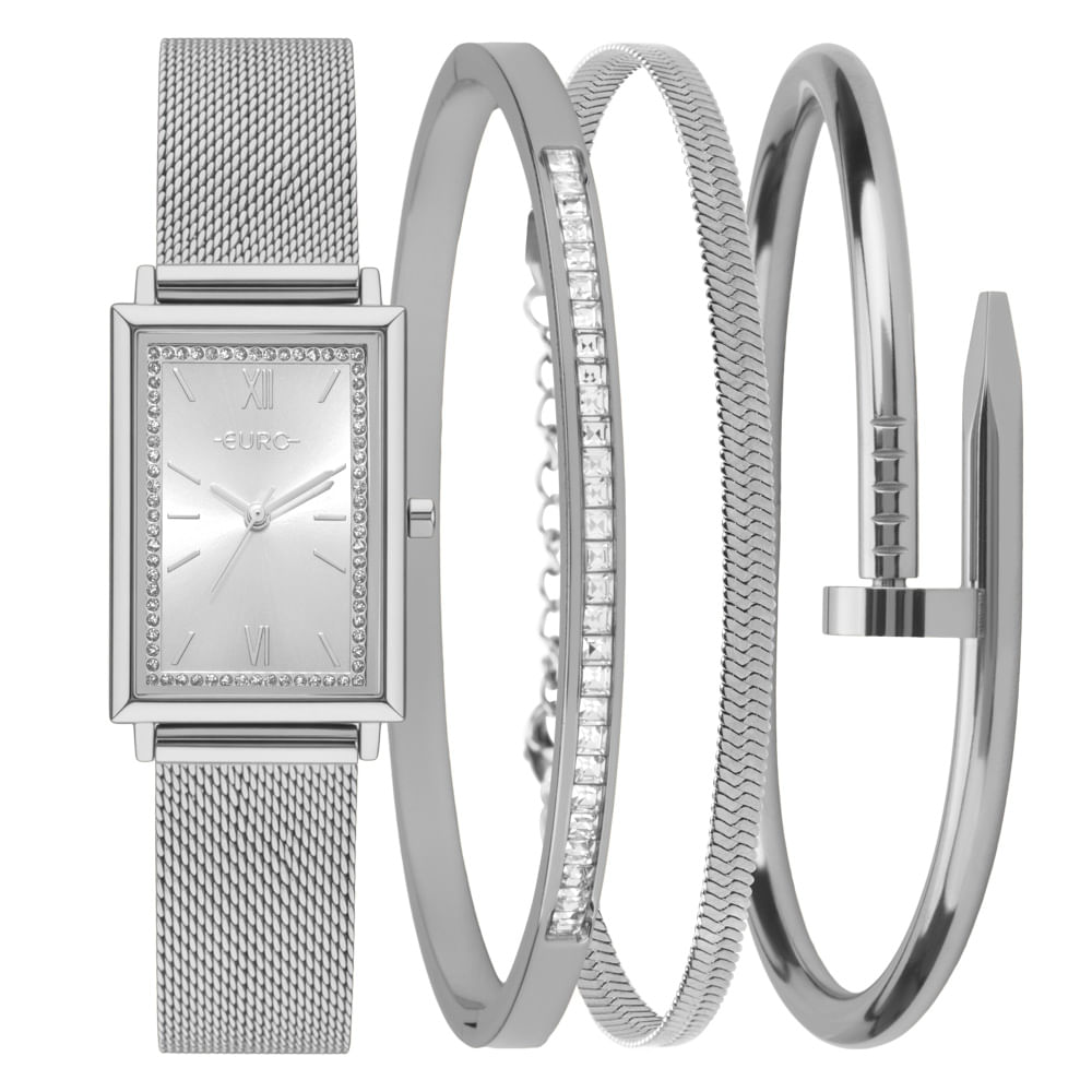 Com design refinado e mostradores sofisticado, a Euro Mix transforma qualquer look. Perfeita para quem ama versatilidade e um look com mix de acessórios. Com braceletes complementares atemporais e refinados, é um conjunto pensado como jóia de pulso autoral.